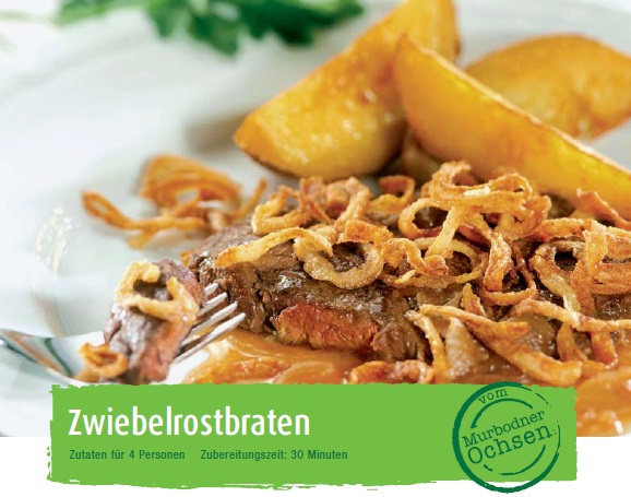 4 Scheiben Rostbraten, (á ca. 18 dag), 60 dag Zwiebeln, 1/8 l Bratensaft, 1/4 l Rindsuppe, Salz, Pfeffer